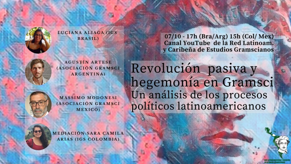 Participan: Luciana Aliaga (International Gramsci Society – Brasil); Agustín Artese (Asociación Gramsci Argentina) ; Massimo Modonesi (Asociación Gramsci México); Sara Camila Arias (Asociación Gramsci Colombia).
