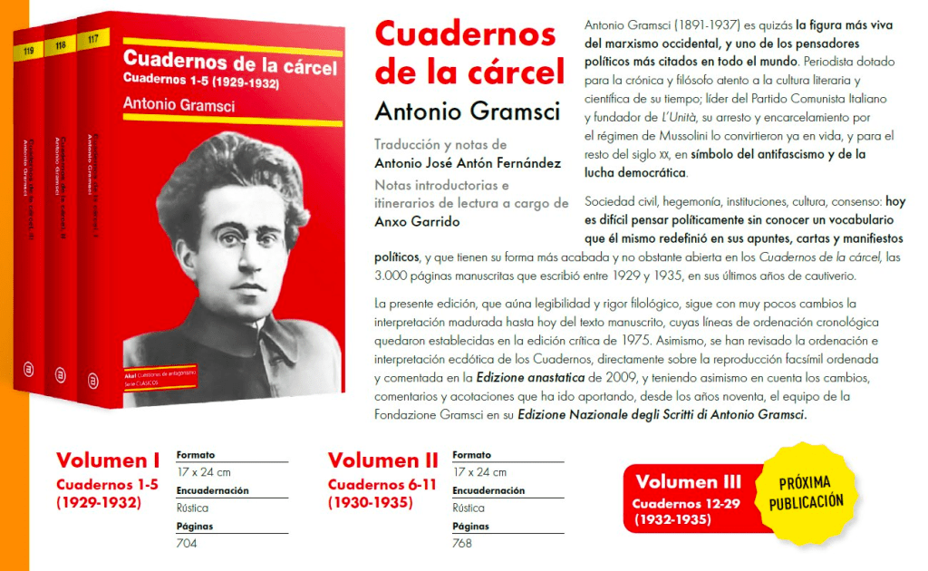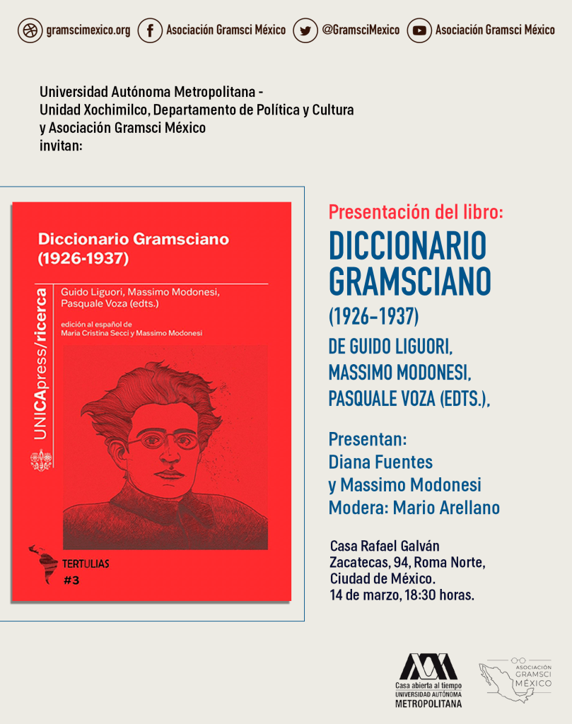 La Asociación Gramsci México pone a la venta el libro Diccionario Gramsciano (1926-1937) de Guido Liguori, Massimo Modonesi y Pasquale Voza (edts.) en su edición al español de Massimo Modonesi y María Cristina Secci. Para adquirirlo le solicitamos que nos haga llegar la siguiente información al teléfono +52 55 3410 4719 (WhatsApp) o al correo marioarellanogonzalez@hotmail.com.