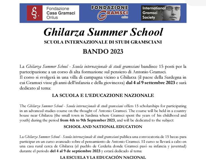 La Ghilarza Summer School – Scuola internazionale di studi gramsciani publica una convocatoria de 15 becas para participar en un curso avanzado sobre el pensamiento de Antonio Gramsci. El curso se llevará a cabo en una casa rural cerca de Ghilarza (el pueblo de Cerdeña donde Gramsci pasó su infancia y juventud) durante el periodo del 4 al 9 de septiembre 2023 y estará dedicado al tema: La escuela y la educación nacional.